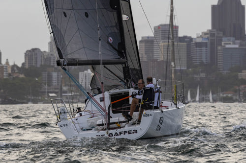 The mystery yacht The Gaffer wasn’t eligible to enter as it hadn’t done a qualifying passage. But co-skippers Rob Frayne and Richard Dumas were determined to get some on-water time on board the four-month-old yacht.